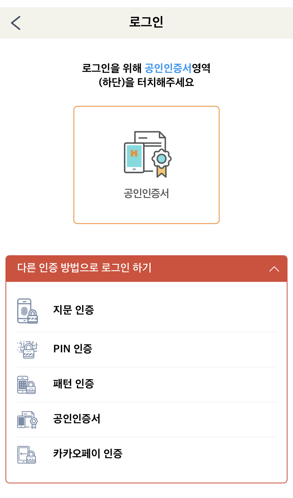 보험금 청구 메뉴를 선택하면 로그인 하는 화면이 나오게 됩니다. 공인인증서나, 지문인증, PIN인증, 패턴인증, 카카오페이 인증을 통해 로그인할 수 있으니 보험금 청구 전, 어플리케이션의 인증센터를 통해 인증 방법을 등록 후 로그인을 합니다. 저의 경우에는 공인인증서를 등록하고 공인인증서로 로그인을 하고 있습니다. 한가지 아쉬운 점은 제가 아이폰 11을 사용하고 있는데 페이스아이디가 지원되지 않는 점은 개선이 필요해보입니다. 인증서 등록 후 로그인을 진행해줍니다.