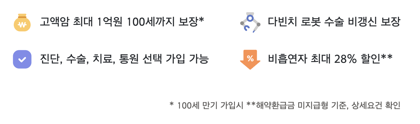 - 암 진단금 : 일반암 최대 5,000만원, 고액암 최대 5,000만원